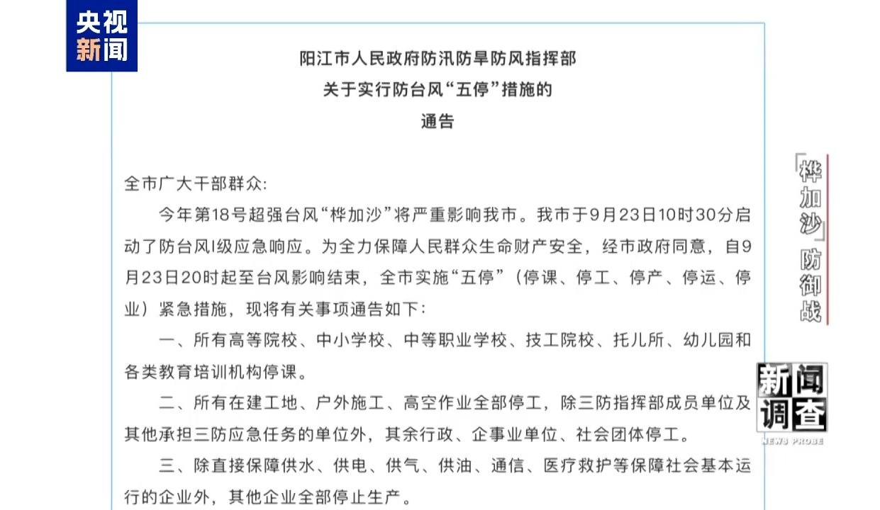 多号的颁布经过记忆阳江应急公,的预报或者施行“五停”要领从9月21日23点31分,点43分的预公布到9月22日15,6分的正式“五停”通告再到9月23日15点4,要领分步施行、渐渐饱动这个强造性的社会管控。